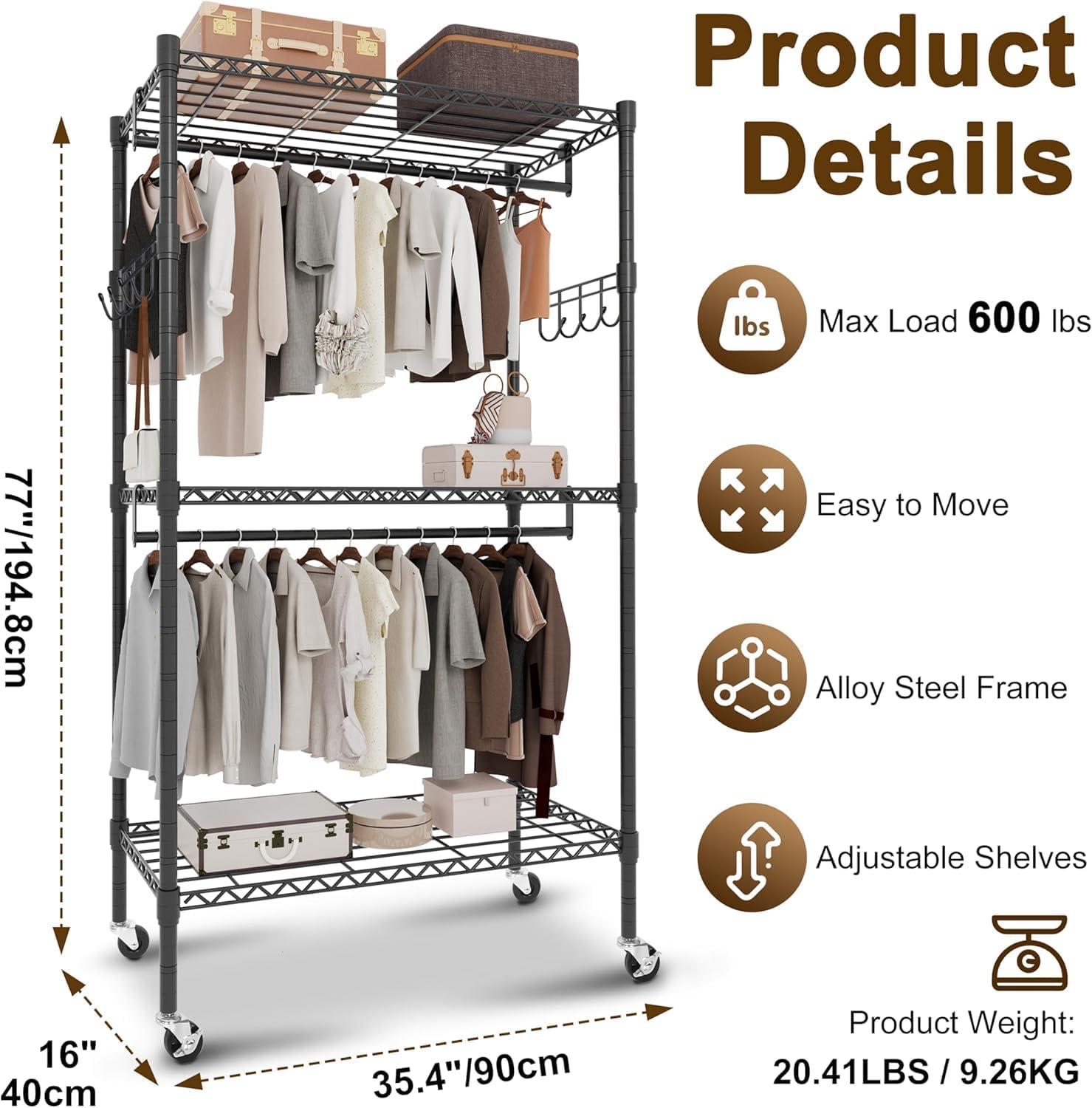 Whitmor Foldable Garment Rack – Rolling Clothes Rack – Adjustable Height – Silver(36 x 20 x 73 inch Black)