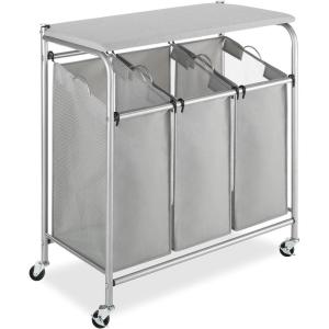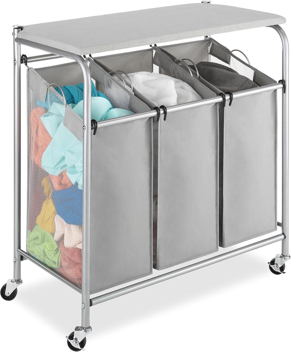 Whitmor 3 Section Rolling Laundry Sorter with Folding Station – Ironing Board, Chrome / Gray(3 Section A,Grey)
