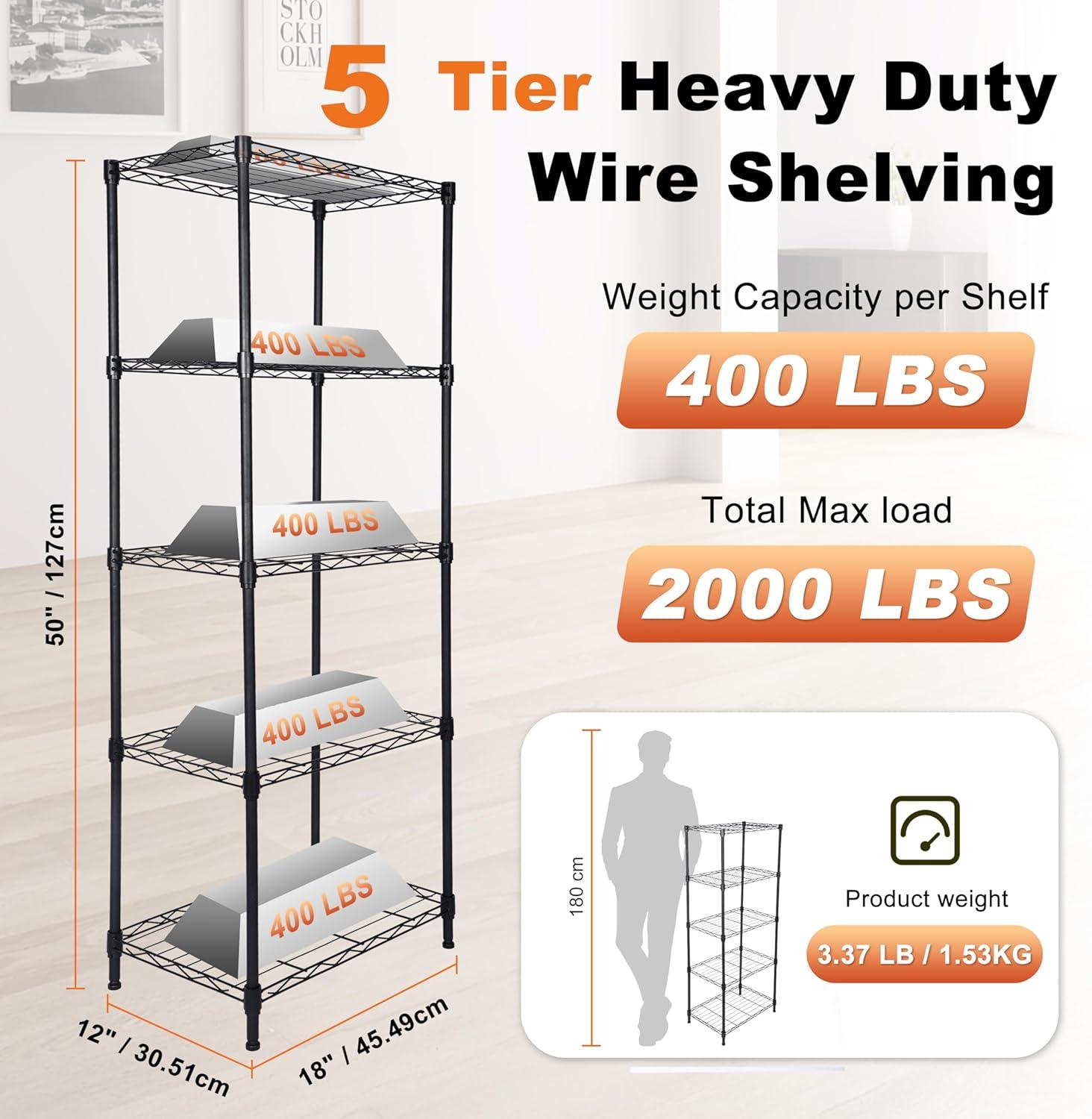 Whitmor Supreme 5 Tier Adjustable Shelving – 500 Pound Weight Capacity Per Shelf – Leveling Feet(5-tier 18″l X 12″w X 50″h)
