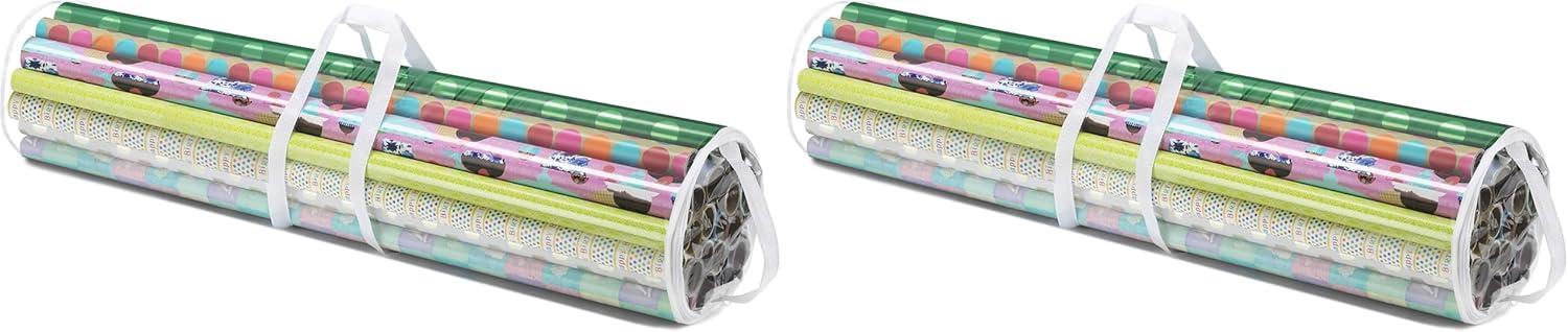 9.375 in x 41 in (23.08 cm x 104.1 cm). Bringing organization home. Stores over 20 rolls of wrapping paper. Designed for tall, 40 inch wide rolls. Secure zip top closure and easy carry handles. www.whitmor.com. Made in China.