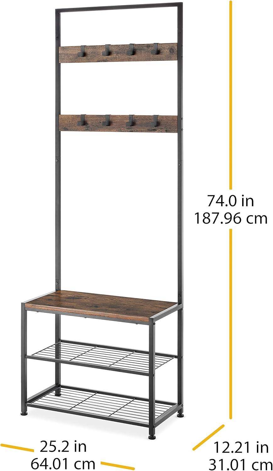 Whitmor Modern Industrial Entryway Coat Rack Hall Tree w/Shoe Storage, Rustic Brown