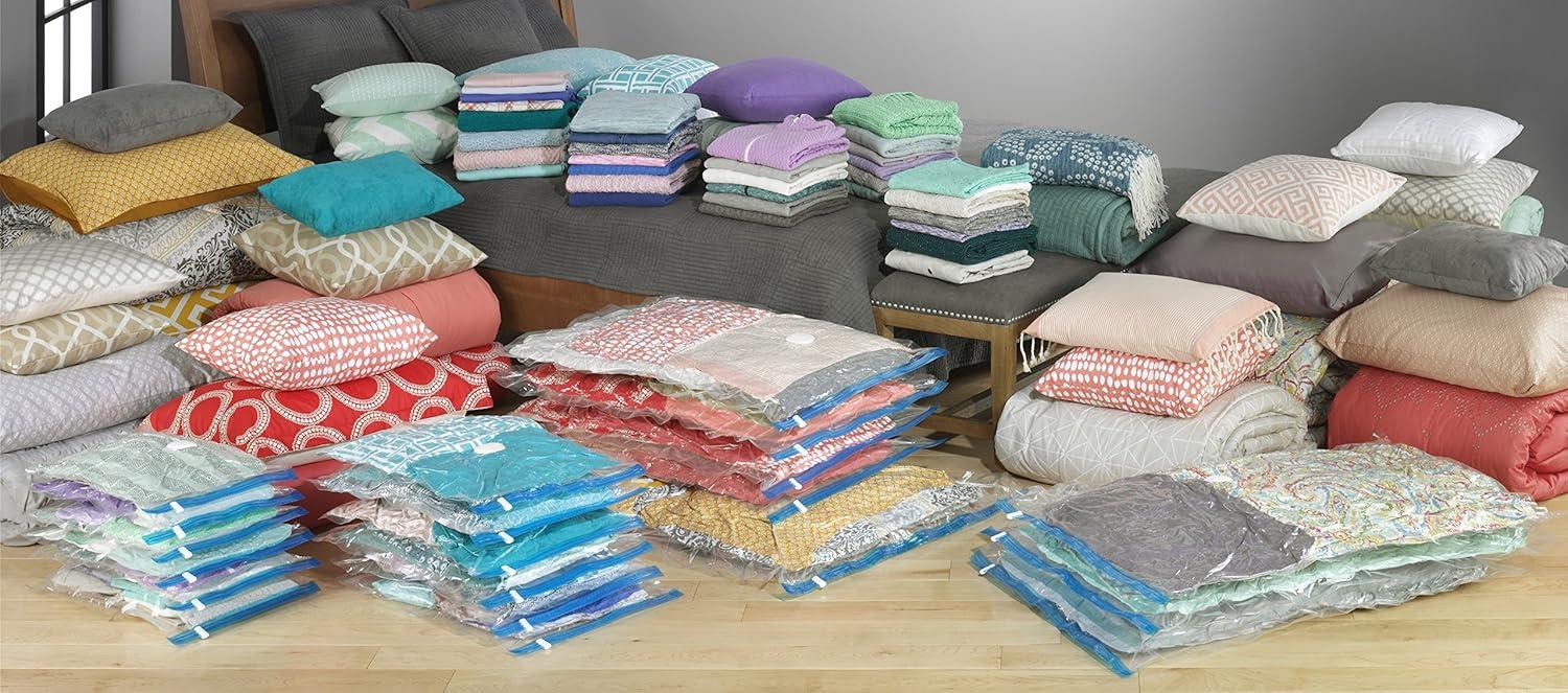 Shrink duvets, pillows, blankets and other bulky bedding with bags leftover to tackle closet clutter; great for moving, off to college, travel and so much more