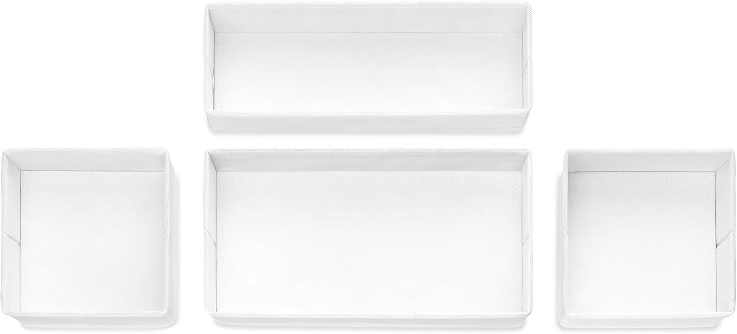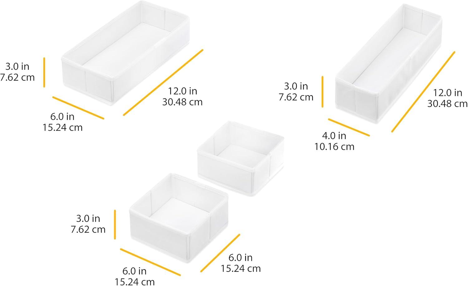 2 Small: 6 x 6 x in (15.2 x 15.2 x 7.6 cm). 1 Medium: 12 x 4 x 3 in (30.5 x 10.2 x 7.6 cm). 1 Large: 12 x 6 x 3 in (30.5 x 15.2 x 7.6 cm). Bringing organization home. Durable, non-woven fabric. www.whitmor.com. Made in China.
